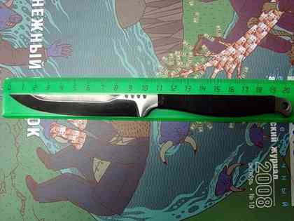 Из особенностей строения хочу отметить, что в средней части клинка нож в сечении имеет форму ромба (могу ошибаться с названием специфических терминов). При этом с верху, сделано дополнительное лезвие, длиной чуть больше 4,5 см. Смысл его остается для меня загадкой, однако предположу, что, возможно, это сделано (судя по целевому назначению ножа) для нанесения максимального ущерба противнику при вытаскивании данного предмета из тела после укола (кроме того, опять уменьшение массы клинка и дизайн =).