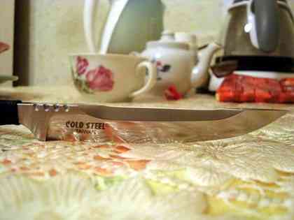 Некоторые особенности кухонного применения. Из-за сильного угла свода клинка, держать прямо нож не получается, его уводит в сторону. Поэтому при резе вязких и упругих продуктов (системы — колбаса/сыр) нож приходиться немного наклонять вправо, но к этому быстро приспосабливаешься.