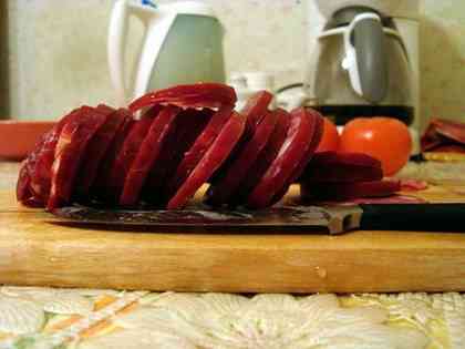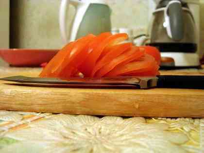 При нарезке томатов не наблюдается заминания кожуры (после нарезания колбасы и сыра, нож не утратил своей остроты). Как и предыдущих тестах, нарезка производилась пилящими движениями, что позволяло не применять дополнительной силы при резе, которая могла вызвать заминания томата (куски нарезались до почти прозрачных).