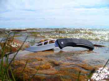 Нож — очень легкий. Его вес — около 80 грамм. Плоский. В прошлый отпуск вешал его прямо на шорты-плавки, и он никак о себе не напоминал. Лезвие длинной — 90 мм. Для меня это оптимальный компромисс между удобством ношения и удобством работы. Более длинный клинок вызывал бы дополнительные вопросы у сотрудников милиции и был бы менее удобен при ношении на поясе за ремнем на клипсе, а короткое лезвие … — это короткое лезвие…