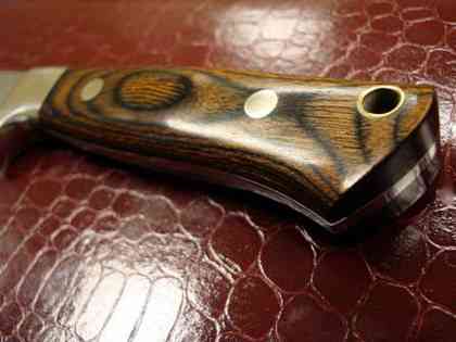 Дальше-проще, пошёл я в наш местный магазин японских ножей и очень удивился, увидев что вот он — лежит на прилавке, можно подержать в руках и даже купить:)!!! Хотя, если честно, сначала он особого впечатления на меня не произвёл. На фоне других художественно — ножевых изысков, представленных в том магазине, будущий избранник смотрелся довольно скромно, а уж по цене и подавно… Начал я им проникаться только когда взял в руки, первая мысль— какой тяжёлый!!! Вторая — тяжёлый, значит надёжный. Мало того что монтаж ножа накладной, что само по себе добавляет веса, так ещё и толщина клинка увеличивается в сторону, противоположную острию, до самого конца рукоятки (такого я ещё не встречал!!!). Всё это вкупе даёт ощутимый баланс в руку, что наверное полезно для той цели, для которой собственно он и изготавливался. Сама рукоять не очень большая. Человеку с крупной ладонью может и не понравится. Но под мою руку очень хорошо подошла, длинны и объёма вполне достаточно для комфортного удержания. В тоже время не навязывает никаких определённых хватов можно держать так, как тебе удобно в данный момент. Гарда хорошо предохраняет пальцы от попадания на РК, но не настолько велика что бы мешать работе. Плюс очень приятные тактильные ощущения от полированной микарты… Короче, я его купил… Правда продавец в магазине уверил меня что сталь на нём VG-10,а на рукояти какое то дерево, но это пусть останется на совести их менеджера по персоналу, я то знал чего покупаю…