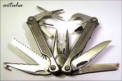 Четыре предмета могут быть приведены в рабочее положение без развертывания рукоятей. Это основной нож, нож-серрейтор со шкуродером на обухе, пила и напильник. Каждый из них фиксируются при помощи персонального замка типа LinerLock. И на каждой пластине фиксатора есть изображение замка а-ля-амбарный:). Рукояти в этих местах имеют фигурный вырез для доступа к пружинам фиксаторов. Это позволяет более удобное снятие блокировки инструмента.