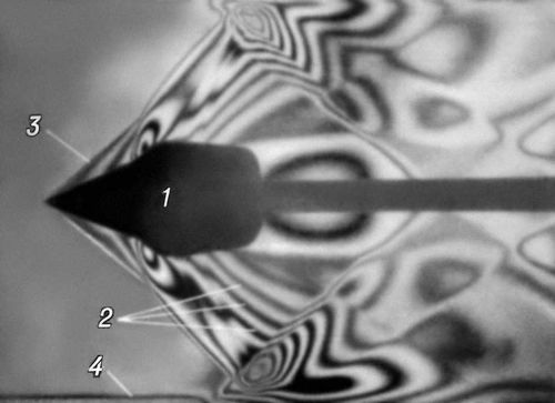 Рис. 4. Интерферограмма обтекания модели сверхзвуковым потоком: 1 — модель; 2 — линии одинаковой плотности; 3 — поверхность ударной волны; 4 — пограничный слой на поверхности сопла.
