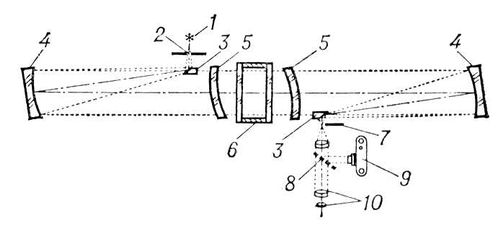 Рис. 2. Схема прибора Тёплера: 1 — источник света; 2 — щель; 3 — зеркала; 4 — сферические зеркала; 5 — мениски; 6 — рабочая часть аэродинамической трубы; 7 — нож Фуко; 8 — полупрозрачное зеркало; 9 — фотокамера; 10 — окуляр.