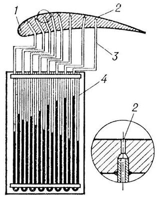 Рис. 1. Схема измерения статических давлений на поверхности модели: 1 — модель; 2 — дренажные отверстия; 3 — трубки; 4 — манометр.