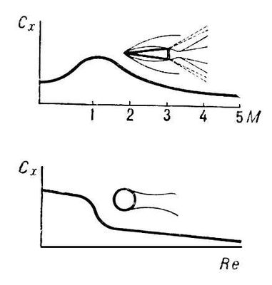 Для аппаратов больших размеров, летящих на малой высоте с дозвуковой скоростью, для которых М-число М < 0,2, А. к. зависит только от формы летательного аппарата и угла атаки (угла между характерной плоскостью и направлением скорости полёта). В общем случае А. к. зависят от вязкости и сжимаемости газа, характеризуемой безразмерными подобия критериями: М-числом и Рейнольдса числом (рис. 1 и 2).
