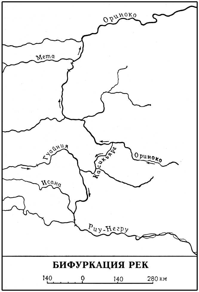 Бифурка'ция рек, разделение реки и её долины на 2 ветви, которые в дальнейшем не сливаются, впадают в различные бассейны. Чаще всего Б. р. возникает в результате размыва поверхностными водами плоских водоразделов; наблюдается сезонная Б. р., когда перелив воды из одного бассейна в другой происходит во время половодий. Наиболее известна Б. р. в системе р. Ориноко (Южная Америка).