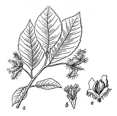 Бук восточный: ветка с плодами; б — мужской цветок; в — плоды в плюске.