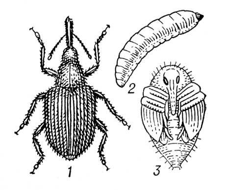 Букарка: 1 — жук; 2 — личинка; 3 — куколка.