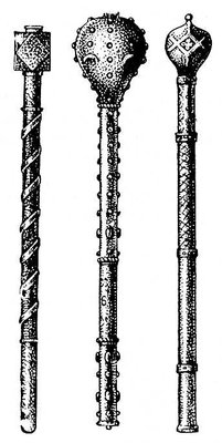Булава', старинное оружие в виде стержня с головкой, длиной около 0,5—0,8 м . Б. с каменной головкой появилась в неолите, с металлической — в бронзовом веке. Это оружие характерно для Древнего Востока. В античном мире оно применялось мало; у римлян Б. (клава) введена лишь во 2 в. н. э. В средние века Б. существовала на мусульманском Востоке, в Западной Европе (с 13 в.), была распространена в Русском государстве 13—17 вв. Различали обычную шарообразную Б. и шестопёр, головка которого была разделена на продольные дольки. У многих племён и народов Б. была не столько оружием, сколько символом власти. До 19 в. она служила символом власти и достоинства у турецких пашей, польских и украинских гетманов. У казаков сохранилась до начала 20 в. под названием насеки как принадлежность станичных и поселковых атаманов.