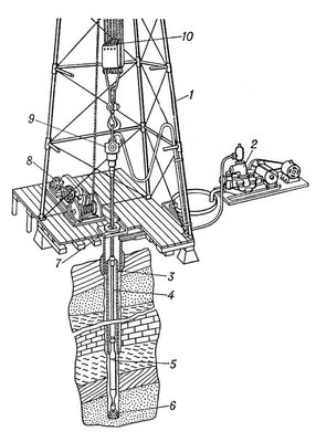 Рис. 1. Общая схема буровой установки: 1 — буровая вышка; 2 — буровые насосы; 3, 4 — обсадные и бурильные трубы; 5 — турбобур; 6 — долото; 7 — ротор; 8 — буровые лебёдки; 9 — вертлюг; 10 — талевая система.