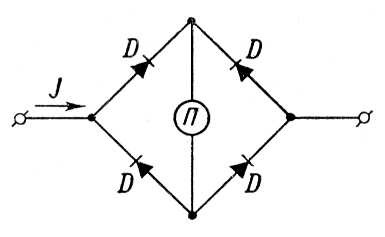 Выпрями'тельный электроизмери'тельный прибо'р, служит для измерения характеристик переменного тока; состоит из выпрямителя тока и магнитоэлектрического прибора , который измеряет либо среднее значение выпрямленного тока, либо отношение средних значений выпрямленных токов. Выпрямляющим элементом обычно служат полупроводниковые приборы. С помощью В. э. п. измеряют напряжение, силу тока, частоту, фазу, мощность. На рис. изображена упрощённая схема В. э. п. для измерения силы переменного тока J. Диоды D образуют двухполупериодную схему выпрямления. Среднее значение выпрямленного тока измеряется магнитоэлектрическим прибором П . Включение в цепь тока J последовательно с выпрямительной схемой добавочного сопротивления позволяет применить данную схему для измерения напряжения переменного тока. Шкала электроизмерительного прибора П обычно градуируется в действующих значениях напряжения или силы переменного тока синусоидной формы. В действительности отклонение указателя прибора П пропорционально среднему значению напряжения или силы тока. Для измерения мощности В. э. п. применяют редко.
