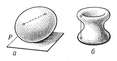Вы'пуклое те'ло, геометрическое тело, обладающее тем свойством, что соединяющий две его любые точки отрезок содержится в нём целиком. На рис. тело а выпукло, а тело б не выпукло. Шар, куб, шаровой сегмент, полупространство — примеры В. т. Любая связная часть границы (см. Связное множество ) В. т. называется выпуклой поверхностью. Через каждую точку границы В. т. проходит по крайней мере одна опорная плоскость, имеющая общую точку (или отрезок, или часть плоскости) с границей тела, но не рассекающая его (плоскость Р на рис. а). В точках, где граница В. т. — гладкая поверхность, опорная плоскость будет касательной. В тех точках, где гладкость нарушается (например, в вершине куба), можно провести бесконечно много опорных плоскостей. В. т. могут быть пяти типов: конечные (граница — замкнутая выпуклая поверхность), бесконечные (граница — одна бесконечная поверхность; например, В. т., ограниченное параболоидом), бесконечные в обе стороны цилиндры (граница — замкнутая выпуклая цилиндрическая поверхность; например бесконечный круговой цилиндр), слои между парами параллельных плоскостей, всё пространство. В. т. могут быть заданы посредством опорной функции, выражающей расстояние от начала координат до опорной плоскости как функцию от внешней нормали к В. т. (т. е. единичного вектора, перпендикулярного опорной плоскости и направленного в сторону того из двух полупространств, определяемых этой плоскостью, в которой нет точек В. т.).