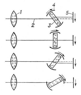 Рис. 1. Принцип оптической компенсации при помощи вращающейся плоскопараллельной стеклянной пластинки: 1 — съёмочный объектив; 2 — главный луч; 3 — стеклянная пластинка; 4 — цилиндрический обтюратор; 5 — киноплёнка.