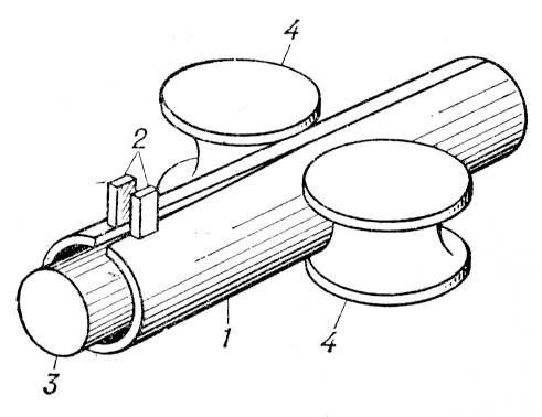 Рис. 2. Схема сварки труб контактным способом: 1 — труба; 2 — скользящие контакты; 3 — сердечник; 4 — обжимные ролики.