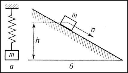 Движение Д. с. может быть как замедленным, или затухающим, так и ускоренным. Например, колебания груза, подвешенного к пружине (рис., а), будут затухать вследствие сопротивления среды и внутреннего (вязкого) сопротивления, возникающего в материале самой пружины при её деформациях. Движение же груза вдоль шероховатой наклонной плоскости, происходящее, когда скатывающая сила больше силы трения (рис., б), будет ускоренным. При этом его скорость v, а следовательно, и кинетическая энергия Т = mv2/2, где m — масса груза, всё время возрастают, но это возрастание происходит медленнее, чем убывание потенциальной энергии П = mgh (g — ускорение силы тяжести, h — высота груза). В результате полная механическая энергия груза Т + П всё время убывает.
