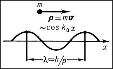 Рис. 1. Сопоставление волны и свободно движущейся частицы. Вверху показано прямолинейное движение частицы с массой m и импульсом p = mv (v — скорость частицы), внизу — распространение соответствующей ей «материальной волны» y0 ~ cos kx с длиной волны l = h/p.