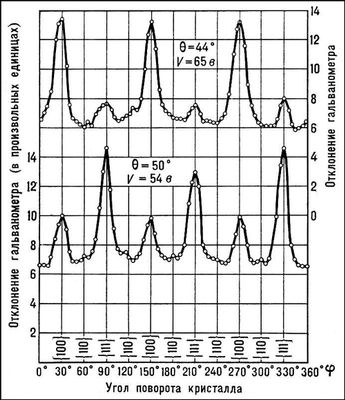 Рис. 3. Запись дифракционных максимумов в опыте Дэвиссона — Джермера по дифракции электронов при различных углах поворота кристалла j для двух значений угла отклонения электронов q и двух ускоряющих напряжений V. Максимумы отвечают отражению от различных кристаллографических плоскостей, индексы которых указаны в скобках.