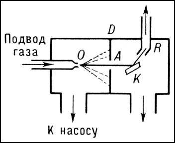 Рис. 4. Принципиальная схема прибора для исследования дифракции атомных или молекулярных пучков: А — атомный или молекулярный пучок; К — кристалл; О — капилляр, подводящий газ; D — диафрагма; R — приёмник, соединённый с манометром. Манометр измеряет давление, созданное дифрагированным пучком.