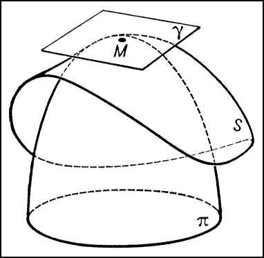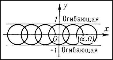 Одним из объектов исследований в Д. г. являются семейства кривых и поверхностей. Такие семейства задаются посредством уравнений, содержащих параметры. Например, уравнение (х– a)2 + у2 = 1, содержащее параметр a, определяет семейство окружностей радиуса 1 с центрами в точках (a, 0), т. е. на оси Ox (рис. 12). С семейством кривых (поверхностей) связано понятие огибающей — такой кривой (поверхности), которая касается всех кривых (поверхностей) семейства. В рассмотренном выше примере огибающей будет пара параллельных оси Ox прямых, отстоящих от неё на расстоянии 1. Особенно детально в Д. г. исследованы двупараметрические семейства прямых b в пространстве, называемые конгруэнциями. Простейший пример конгруэнции — семейство параллельных прямых в пространстве. Истоком теории конгруэнций является геометрическая оптика.