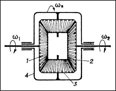 Конический дифференциал 1 и 2 — центральные колёса; 3 — сателлит; 4 — водило; w1, w2, и wB — угловые скорости центральных колёс и водила.