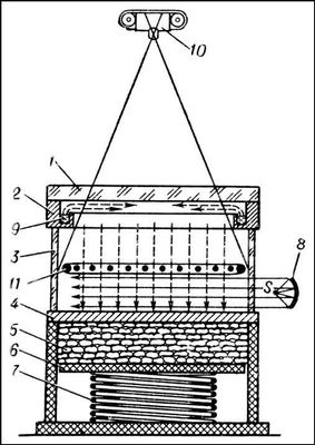 Рис. Схема диффузионной камеры: 1 — верхнее стекло; 2 — металлическое корытце с метиловым спиртом 9; 3 — стеклянный цилиндр (боковая поверхность камеры); 4 — металлическое дно камеры, охлаждаемой твёрдой углекислотой 5; 6 — поршень из термоизолирующего материала; 7 — сжатая пружина; 8 — параболическое зеркало; 10 — фотоаппарат; 11 — металлическое кольцо с редкой сеткой из тонкой проволоки для создания очищающего от ионов электрического поля; S — источник света.