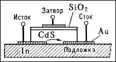 В другом типе триода (рис. 3) затвор помещён вне диэлектрика CdS; его роль сводится к изменению распределения потенциала в диэлектрике, от чего существенно зависит величина тока. Физическая картина явлений в этих триодах значительно сложнее и существенно отличается от протекания эмиссионных токов в вакууме. Распространение получили триоды с изолированным затвором МОП (металл—окисел— полупроводник) или МДП (металл—диэлектрик—полупроводник).
