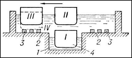 Рис. 2. Схема поперечного сечения наливного дока: 1 — канал; 2 — площадка; 3 — опоры для судов; 4 — судно (римские цифры — последовательные позиции судна при постановке в док).