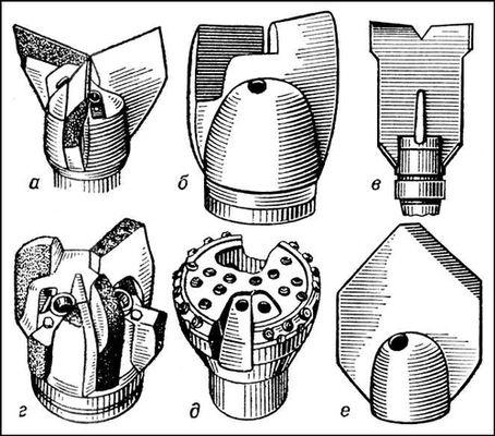 Рис. 3. Лопастные долота; а — трёхлопастное; б — двухлопастное; в — типа «РХ»; г — истирающе-режущие типа «ИР»; д — фрезерное типа «ФР»; е — пикообразное.