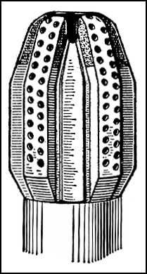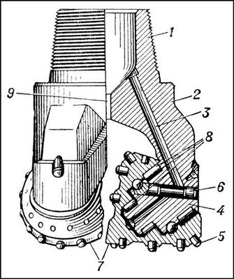 Рис. 1. Трёхшарошечное долото для сплошного бурения в очень крепких породах: 1 — наружная конусная присоединительная резьба (ниппель); 2 — секция (лапа) долота; 3 — каналы в лапе и цапфе для продувки опоры; 4 — цапфа лапы; 5 — твердосплавные зубки с полусферической рабочей частью; 6 — замковый палец; 7 — шарошки; 8 — подшипники качения; 9 — центральный канал для продувки забоя и шарошек.