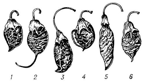 Рис. 2. Бобы донника: 1 — белого; 2 — жёлтого; 3 — волжского; 4 — зубчатого; 5 — каспийского; 6 — крымского.