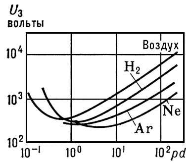 Зависимость потенциала зажигания Uз от pd для различных газов (р — давление газа, d — расстояние между электродами).