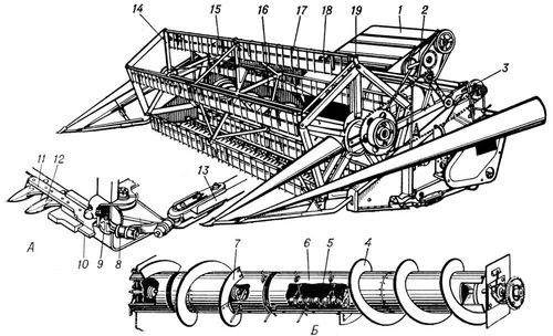 Рис. 1. Шнековая жатка комбайна: 1 — плавающий транспортер; 2 — уравновешивающие пружины; 3 — поддержка мотовила; 4 — спиральная лента; 5 — пальчиковый механизм; 6 — кожух шнека; 7 — съемный виток шнека; 8 — коромысло; 9 — головка ножа; 10 — соединительное звено ножа; 11 — нож; 12 — палец; 13 — шатун; 14 — крестовина мотовила; 15 — лопасть мотовила; 16 — шнек; 17 — палец граблины мотовила; 18 — граблина мотовила; 19 — кривошип граблины; А — присоединение ножа режущего аппарата к шатуну; Б — шнек.