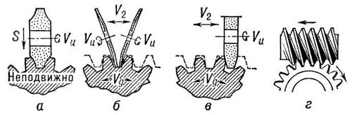 Рис. 6. Схемы зубошлифования: а — по методу профильного копирования фасонным шлифовальным кругом; б — по методу обкатки двумя тарельчатыми шлифовальными кругами; в — по методу обкатки одним дисковым шлифовальным кругом, имеющим профиль зуба рейки; г — по методу обкатки абразивным червяком; Vu и Vg — скорости вращения соответственно инструмента (шлифовального круга) и детали (зубчатого колеса); S — поперечная подача шлифовального круга; V2 — скорость возвратно-поступательного движения шлифовальных кругов.