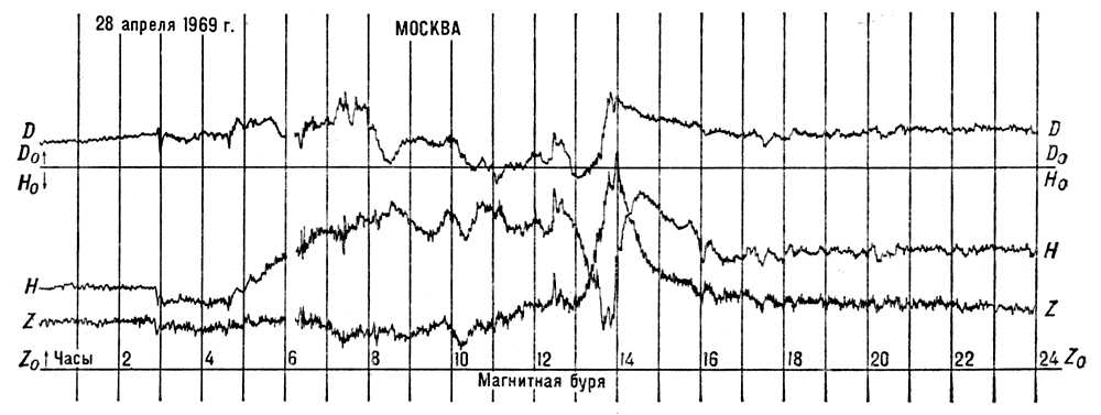 Магнитные возмущения, охватывающие всю Землю и продолжающиеся от одного (рис. 4) до нескольких дней, называются мировыми магнитными бурями, во время которых амплитуда отдельных составляющих может превзойти 1000g. Магнитная буря — одно из проявлений сильных возмущений магнитосферы, возникающих при изменении параметров солнечного ветра, особенно скорости его частиц и нормальной составляющей межпланетного магнитного поля относительно плоскости эклиптики. Сильные возмущения магнитосферы сопровождаются появлением в верхней атмосфере Земли полярных сияний, ионосферных возмущений, рентгеновского и низкочастотного излучений.