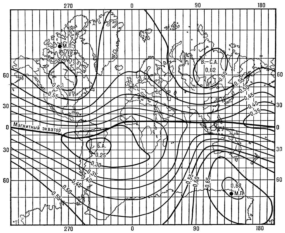 Рис. 2. Карта полной напряжённости геомагнитного поля (в эрстедах) для эпохи 1965 г.; чёрные кружочки — магнитные полюсы (М. П.). На карте указаны мировые магнитные аномалии: Бразильская (Б. А.) и Восточно-Сибирская (В.-С. А.).
