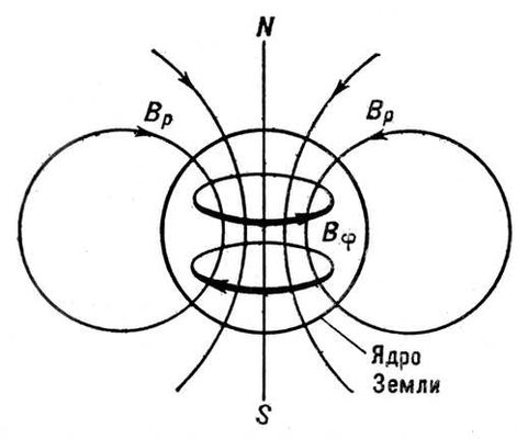 Рис. 3. Схема магнитных полей в гидромагнитном динамо Земли: NS — ось вращения Земли: Вр — поле, близкое к полю диполя, направленного вдоль оси вращения Земли; Bj — тороидальное поле (порядка сотен гаусс), замыкавщееся внутри земного ядра.