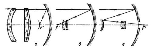Рис. 1. Оптические схемы астрономических зеркально-линзовых систем с линзовыми компенсаторами аберраций: а — сверхсветосильный объектив с большим углом зрения (до 30°), применяемый для фотосъёмки движущихся небесных тел, например метеоров; исправлены все аберрации за исключением кривизны поля изображения; б — телескоп с параболоидальным зеркалом; исправление комы компенсатором У. Росса увеличивает поле зрения системы; в — система Г. Г. Слюсарева и В. С. Соколовой с параболическим большим зеркалом и сферическим малым; исправлены все аберрации, кроме дисторсии: длина системы значительно меньше её фокусного расстояния.