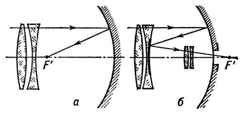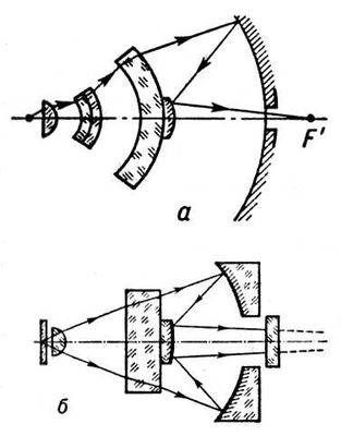 Рис. 2. Оптические схемы зеркально-линзовых фотографических объективов: а — объектив конструкции Д. С. Волосова и Д. Ю. Гальперна с асферическим зеркалом и одним афокальным компенсатором; б — объектив, построенный по усложнённой схеме Кассегрена с двумя сферическими зеркалами и двумя афокальными компенсаторами (один — в параллельном пучке, второй — в сходящемся).