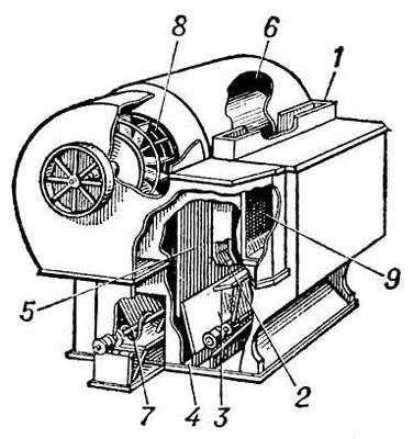 Зернова'я суши'лка, машина для сушки зерна зерновых и зернобобовых культур, семян трав и овощных культур, клеверной пыжины. З. с. используют также для сушки предварительно измельченной зелёной массы клевера, люцерны, вико-овсяной смеси и др. трав в целях получения белково-витаминного корма. В сельском хозяйстве применяют шахтные и барабанные З. с., которые могут быть стационарными и передвижными. В шахтных З. с. (рис. 1) зерно сушится, перемещаясь внутри шахты сверху вниз под действием собственного веса. Теплоноситель (смесь топочных газов с воздухом) при этом поступает по коробам, расположенным в шахте, перпендикулярно направлению движения зерна. В барабанных З. с. (рис. 2) зерно сушится во вращающемся барабане, где оно перемешивается и движется вдоль барабана в потоке теплоносителя. температура теплоносителя в шахтных З. с. при сушке семенного зерна влажностью до 25% не должна превышать 80°С, при влажности более 25% —70 °С. Во время сушки продовольственного зерна влажностью до 25% температура теплоносителя не должна превышать 110°С, для зерна влажностью более 25%—100°С. В барабанных З. с. при сушке семенного зерна влажностью до 25% температура теплоносителя должна быть не более 145—165°С, а при сушке продовольственного зерна влажностью более 25% — 180—210°С. Шахтные З. с. за один пропуск снижают влажность зерна на 6—12%, а барабанные на 5—8%. Производительность З. с. до 8 т/ч. В качестве топлива для З. с. используются дрова, уголь, торф, жидкое топливо.