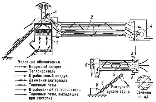 Рис. 2. Передвижная барабанная зерновая сушилка: 1 — топка; 2 — сушильный барабан; 3 и 7 — шнековые транспортёры; 4 и 6 — вентиляторы; 5 — охладительный барабан.