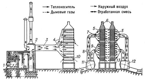 Рис. 1. Стационарная шахтная зерновая сушилка: 1 — топка; 2 — смесительная камера; 3 — труба для подвода теплоносителя; 4 — подводящие диффузоры; 5 — сушильные камеры; 6 — приёмные бункера; 7 и 9 — отводящие диффузоры; 8 — отводящие трубопроводы; 10 — камера охлаждения; 11 и 12 — вентиляторы; 13 — нижний бункер.