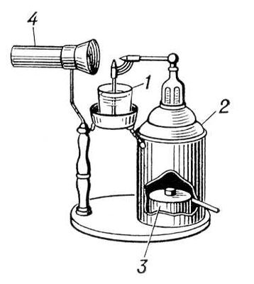 Переносной ингалятор для паровой ингаляции: 1 — стаканчик; 2 — резервуар; 3 — спиртовка; 4 — стеклянная воронка (для вдыхания пара).