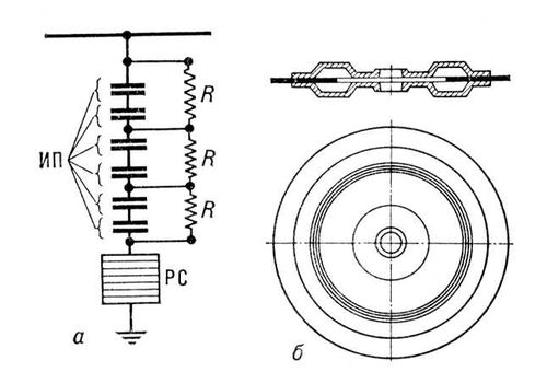 Рис. 2. Вентильный разрядник: а — схема искрового промежутка; б — единичный искровой промежуток.