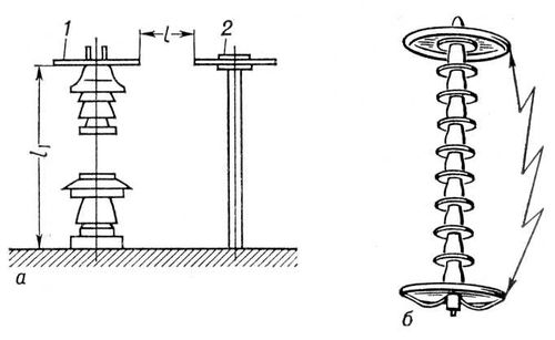 Рис. 1. Защитный искровой промежуток: а — стержневой; б — кольцевой.
