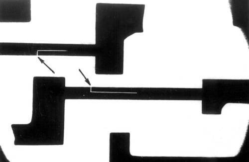 Рис. 4. Лазерная резка: а — резка тонкой хромовой резистивной плёнки с целью подгонки сопротивления (толщина плёнки 0,5 мкм, ширина реза, указанного стрелкой, 50 мкм); б — надрезы на стекле, по которым происходит термическое раскалывание (получены лазером на углекислом газе).