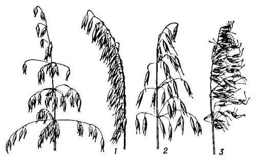 Метёлки овса: 1 — посевного (раскидистого и сжатого); 2 — византийского; 3 — песчаного.