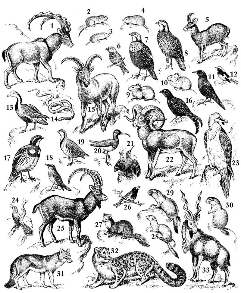Представители горной фауны: 1 — безоаровый козёл; 2 — снежная полёвка; 3 — кустарниковая полёвка; 4 — прометеева полёвка; 5 — серна; 6 — большая чечевица; 7 — каспийский улар; 8 — кавказский улар; 9 — красная пищуха; 10 — большеухая пищуха; 11 — клушица; 12 — краснобрюхая горихвостка; 13 — горный гусь; 14 — ящеричная змея; 15 — кавказский тур; 16 — кавказский тетерев; 17 — тибетский улар; 18 — синий каменный дрозд; 19 — кеклик; 20 — серпоклюв; 21 — краснокрылый стенолаз; 22 — архар; 23 — бородач; 24 — полосатая кустарница; 25 — центральноазиатский козёл; 26 — арчовый дубонос; 27 — каменная куница; 28 — солонгой; 29 — длиннохвостый сурок; 30 — сурок Мензбира; 31 — красный волк; 32 — снежный барс; 33 — винторогий козёл.