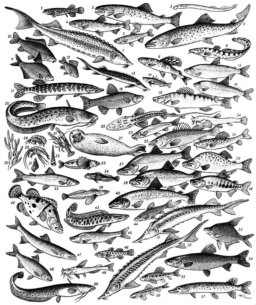 Представители фауны пресных вод. Бассейна Северного Ледовитого океана и южных морей Европейской части СССР (1—21): 1 — чёрная рыба; 2 — сёмга; 3 — речная минга; 4 — голец; 5 — гольян; 6 — таймень; 7 — сибирский осётр; 8 — хариус; 9 — налим; 10 — сазан; 11 — лещ; 12 — золотой карась; 13 — стерлядь; 14 — трёхиглая колюшка; 15 — пелядь; 16 — чир; 17 — щука; 18 — голавль; 19 — судак; 20 — сом; 21 — узкопалый речной рак. Средней Азии (22—26): 22 — амударьинский ложнолопатонос; 23 — маринка; 24 — туркестанский сомик; 25 — балхашский окунь; 26 — голый осман. Байкала (27—36): 27 — байкальская нерпа; 28—29 — бокоплавы (28 — Axelboeckia carpenteri; 29 — Garjajewia cabanisi); 30 — байкальская губка; 31—32 — молюски (31 — Baicalia costata, 32 — B. godlewskii); 33—34 — подкаменщики (33 — Cottocomephorus grewinki, 34 — Cottus kneri); 35 — байкальский омуль; 36 — голомянка. Дальнего Востока (35—57): 37 — нерка; 38 — кижуч; 39 — горбуша; 40 — чавыча; 41 — кета; 42 — китайский окунь; 43 — змееголов; 44 — амурский чебачок; 45 — верхогляд; 46 — головешка; 47 — желтощёк; 48 — толстолобик; 49 — уссурийская касатка лиокассис; 50 — сом Солдатова; 51 — калуга; 52 — амурский осётр; 53 — чёрный амурский лещ; 54 — чёрный амур; 55 — амурский лжепескарь; 56 — восьмиусый пескарь; 57 — амурская щука.