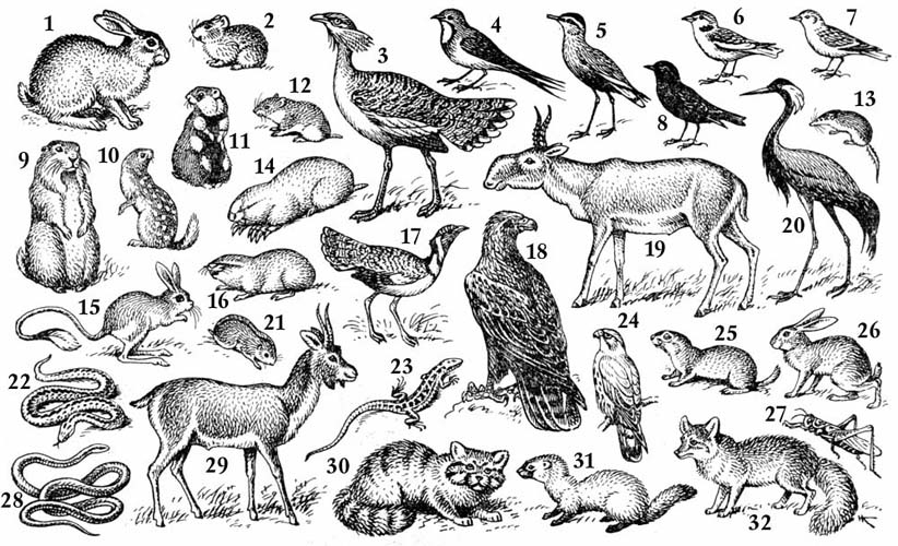 Представители степной фауны: 1 — заяц-русак; 2 — степная пищуха; 3 — дрофа; 4 — луговая тиркушка; 5 — кречётка; 6 — белокрылый жаворонок; 7 — степной жаворонок; 8 — чёрный жаворонок (самец); 9 — обыкновенный сурок; 10 — крапчатый суслик; 11 — обыкновенный хомяк; 12 — хомячок Эверсманна; 13 — белобрюхая белозубка; 14 —обыкновенный цокор; 15 — большой тушканчик; 16 — обыкновенный слепыш; 17 — стрепет; 18 — степной орёл; 19 — сайгак; 20 — журавль-красавка; 21 — степная пеструшка; 22 — степная гадюка; 23 — прыткая ящерица; 24 — степная пустельга; 25 — даурский суслик; 26 — заяц-толай; 27 — перелётная саранча; 28 — желтобрюхий полоз; 29 — дзерен; 30 — манул; 31 — степной хорь; 32 — корсак.